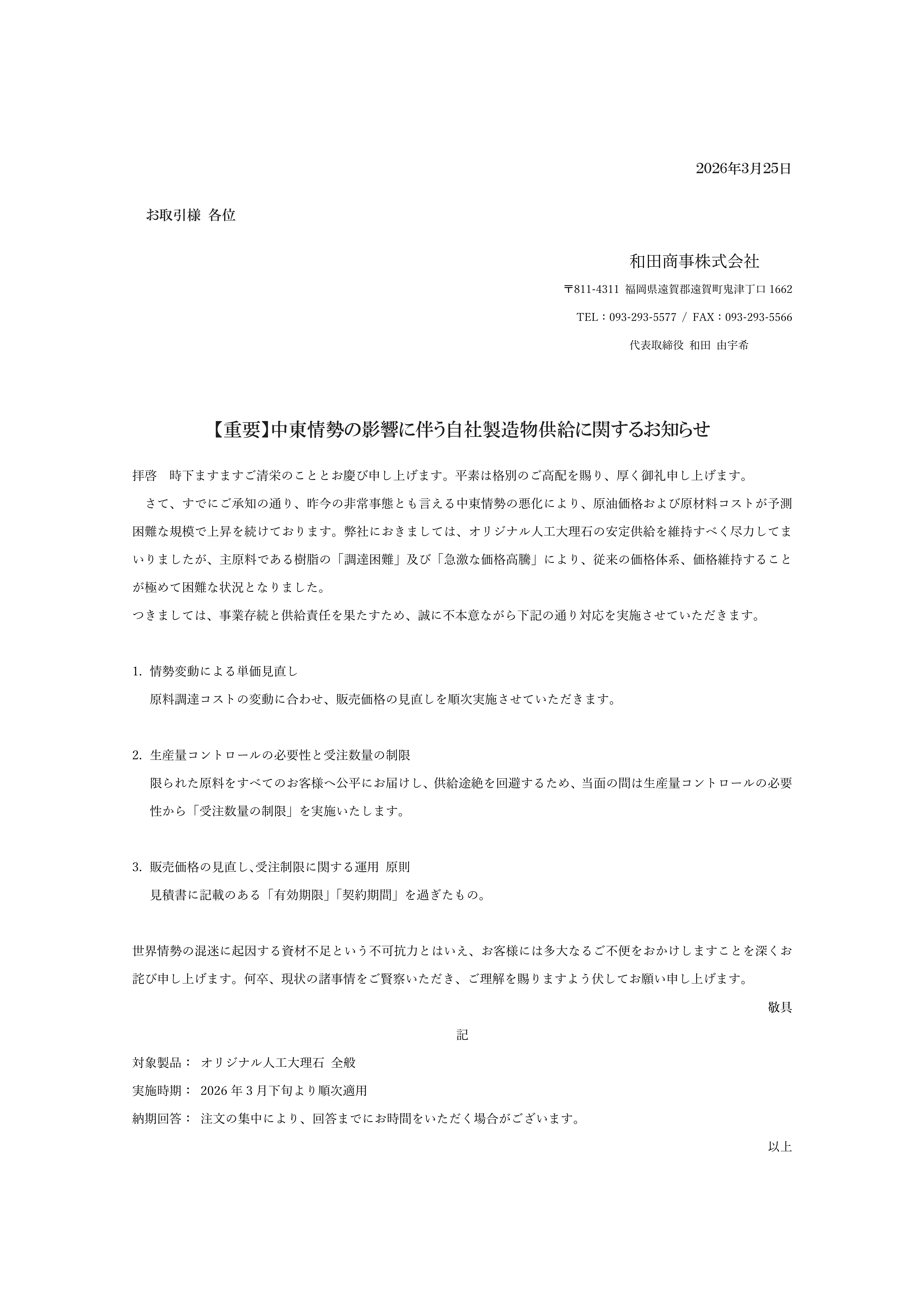この度、中東情勢悪化に伴う原油価格の厳しい変動により、弊社製品の原料調達コストは予測困難な上昇を続けております。